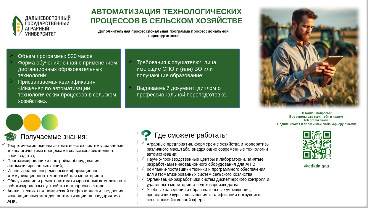 Автоматизация технологических процессов в сельском хозяйствеДоступно мест: 20Записано обучающихся: 0 Стоимость
