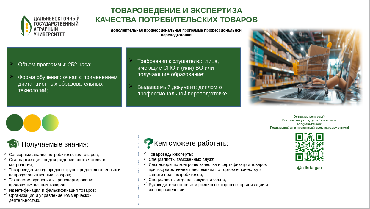 Товароведение и экспертиза качества продовольственных товаровДоступно мест: 18Записано обучающихся: 2 Стоимость